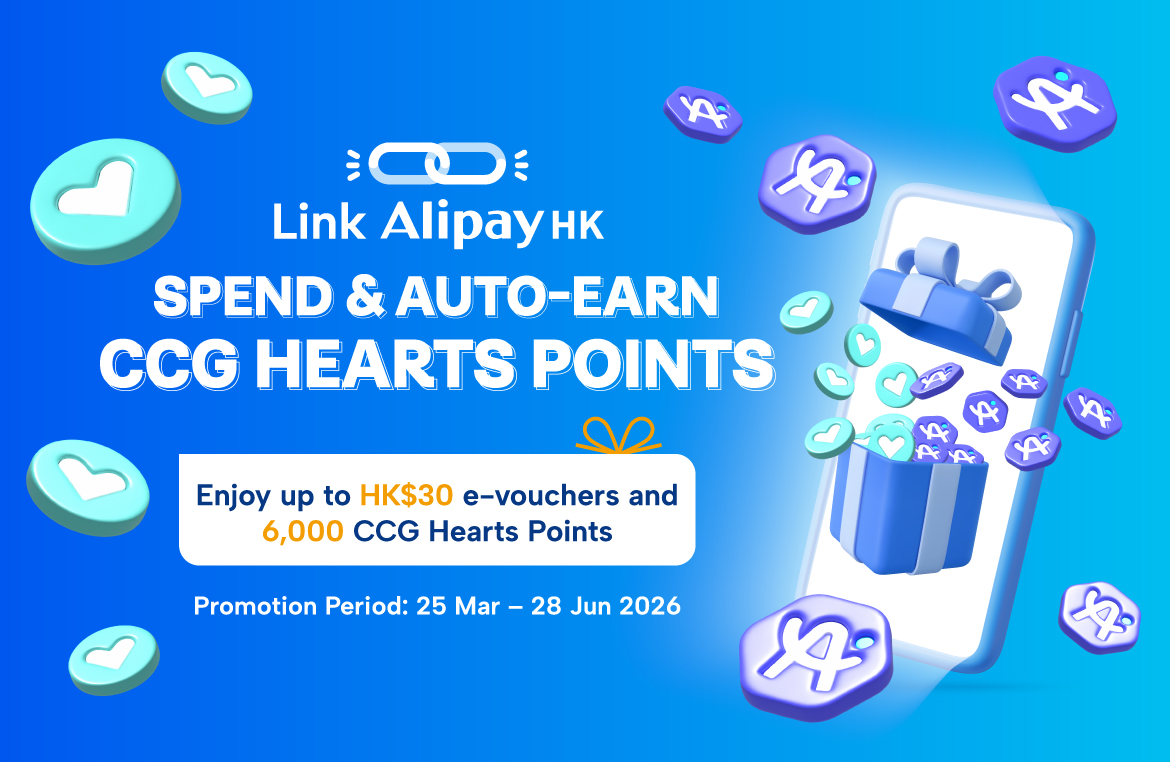 Link now for auto-earn points! Link your CCG Hearts membership in the AlipayHK app, and shop at 400+ selected merchants to earn both CCG Hearts Points and A. Points with every eligible spend of HK$1 or more automatically! Plus, from 25 March to 28 June 2026, enjoy limited-time rewards upon successful linkage and eligible spending with AlipayHK!