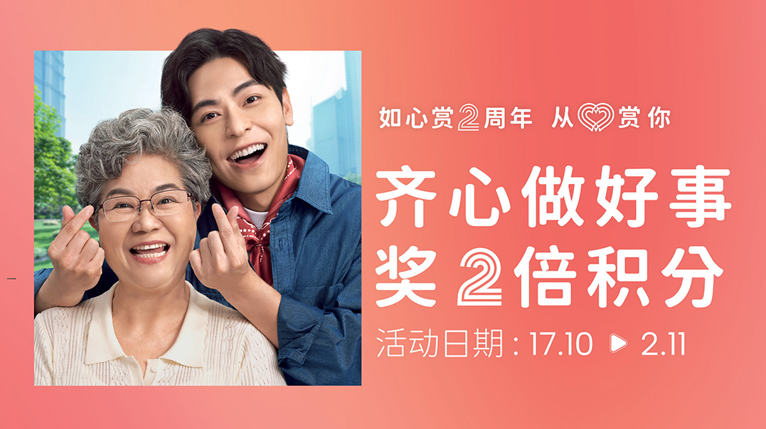 完成指定爱心行动即可享受双倍积分奖励,另外成功推荐好友成为会员,您和好友均可获得1,000积分。 本次推广活动受条款及细则约束,有关活动详情,请前往如心赏 App 了解更多资讯。