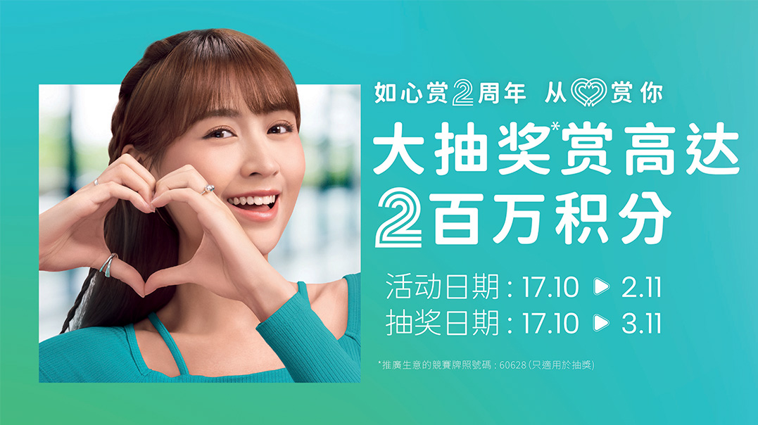 如心广场、D·PARK及中环街市期间限定 — 单笔消费满HK$200并成功登记,即可参加大抽奖,有机会赢取高达200万积分。 此外,连续三个星期五消费可享双倍积分,二人同行还可获赠总值超过HK$200的电子现金券组合。 推广生意的竞赛牌照号码:60628(只适用于抽奖)