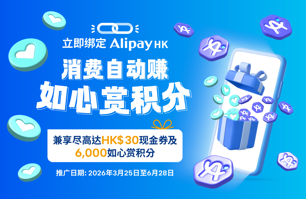 一扫绑定,自动赚分!会员于AlipayHK App绑定如心赏,即可于多达400间自动赚分商户,以 AlipayHK 消费HK$1起,自动赚取如心赏积分及A.Point! 2026年3月25日至6月28日期间,绑定后以AlipayHK进行合资格消费,更有限时多重赏等你拎!