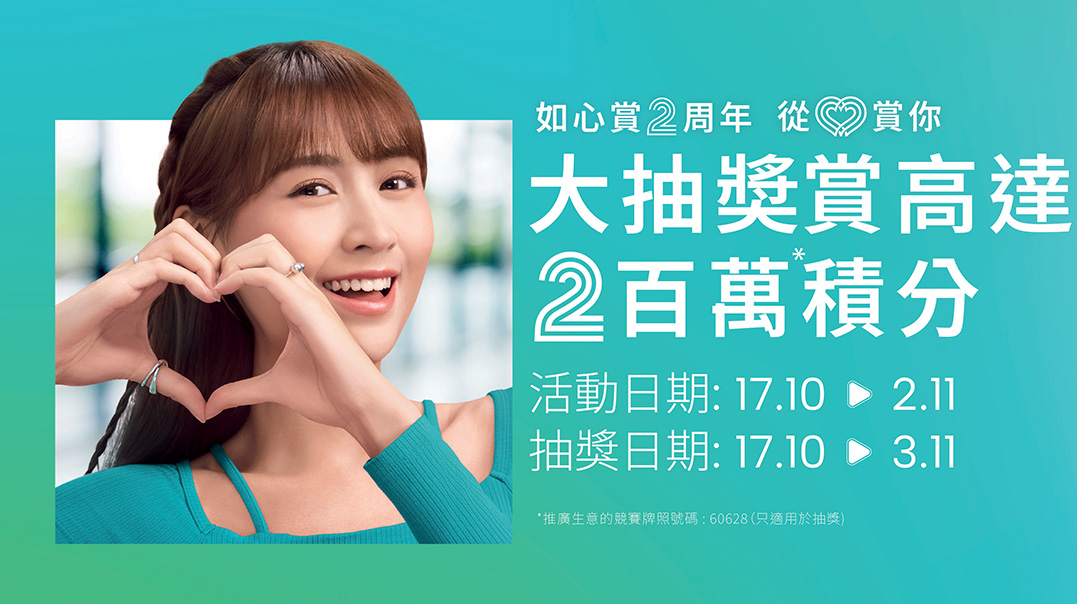 如心廣場、D·PARK及中環街市期間限定 — 單一消費滿HK$200並成功登記,即可參加大抽獎,有機會贏取高達200萬積分。另外,更有連續三個星期五消費即享雙倍積分及二人同行「賞」你總值超過HK$200電子現金券組合。 推廣生意的競賽牌照號碼 : 60628(只適用於抽獎)