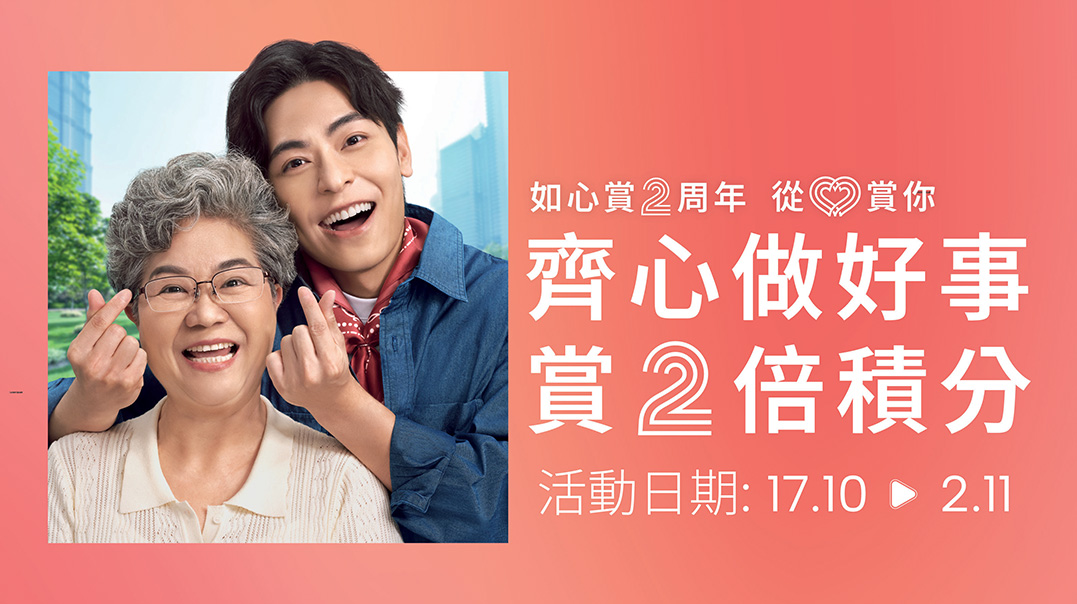 完成指定好心行動即享2倍積分,另外成功推薦好友成為會員,雙方均獲1,000積分。 以上推廣活動均受條款及細則約束,有關活動詳情請前往如心賞App 了解更多。