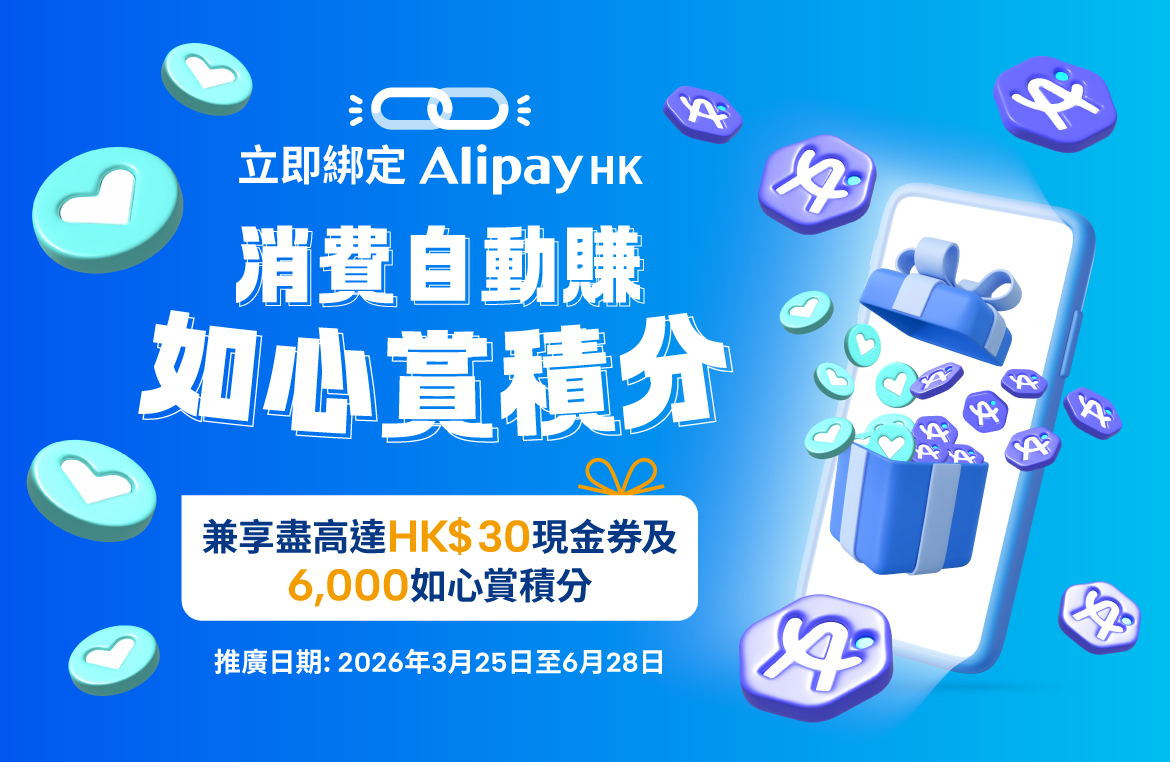 一掃綁定,自動賺分!會員於AlipayHK App綁定如心賞,即可於多達400間自動賺分商戶,以 AlipayHK 消費HK$1起,自動賺取如心賞積分及A.Point! 2026年3月25日至6月28日期間,綁定後以AlipayHK進行合資格消費,更有限時多重賞等你拎!